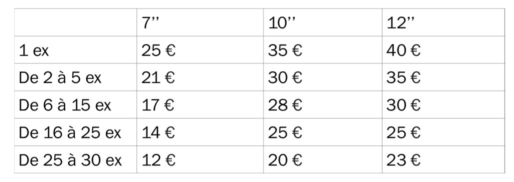 Les disques vinyles sont noirs ou transparents, d’une épaisseur de 2mm et enregistrés en 33 rpm.